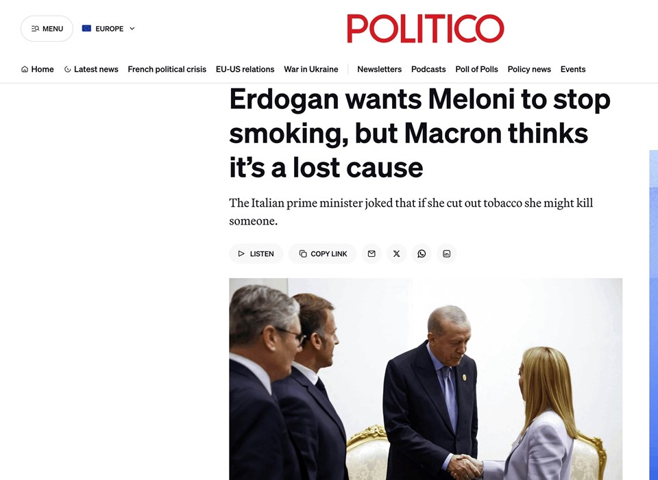 Erdoğan ve Meloni arasındaki diyalog Politico’nun Avrupa baskısında da yer aldı.